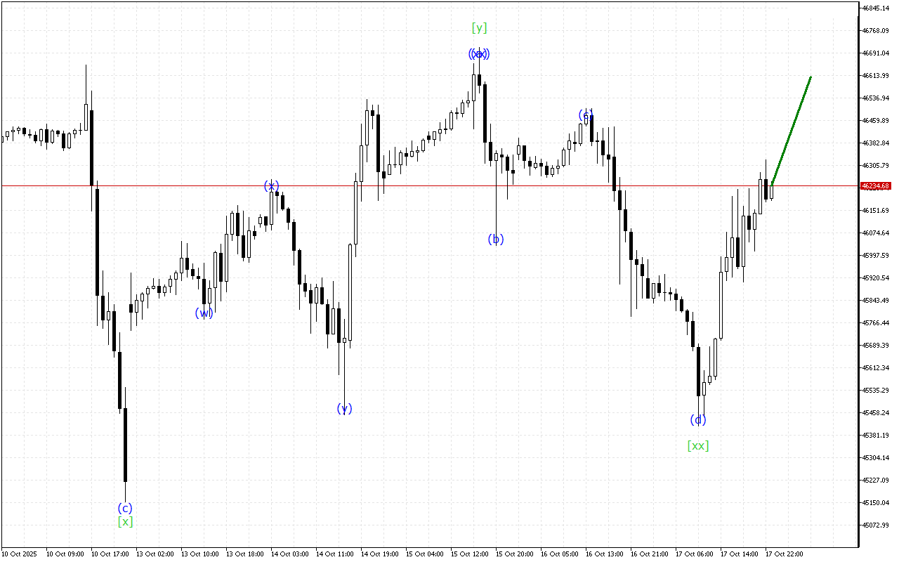 Среднесрочный вектор движения Dow Jones указывает на формирование волновой структуры Тройная тройка. Сейчас завершается формирование волны [хх] и ожидается начало восходящего движения в рамках волны [z].