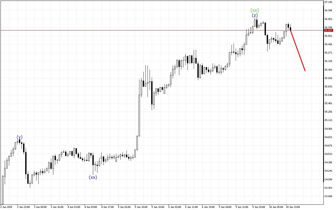 Mayroong pagbuo ng isang triple three wave structure sa isang mas mataas na time-frame. Sa kasalukuyan, nabuo na ang alon [xx]. Pagkatapos nito, dapat ipagpatuloy ng presyo ang pababang paggalaw nito.