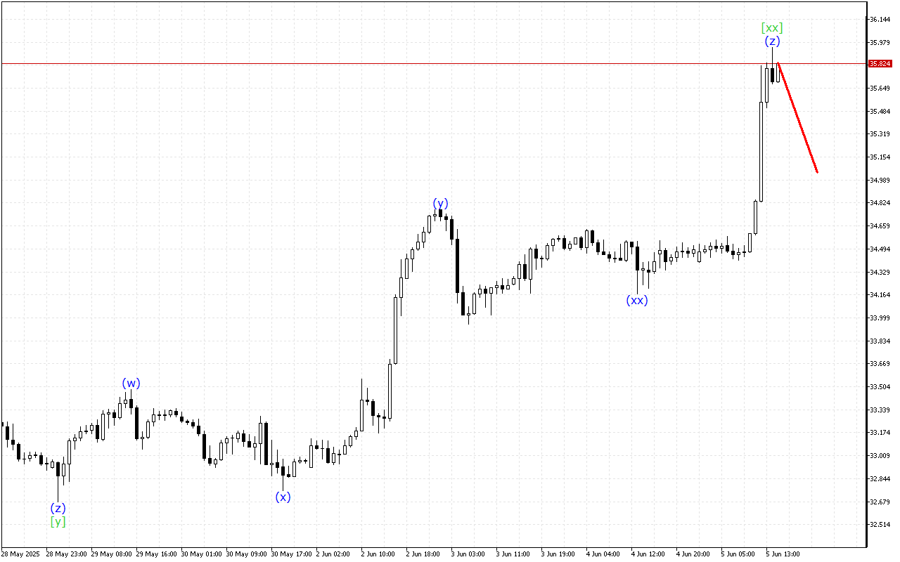 Mayroong pagbuo ng isang triple three wave structure sa isang mas mataas na time-frame. Sa kasalukuyan, nabuo na ang alon [xx]. Pagkatapos nito, dapat ipagpatuloy ng presyo ang pababang paggalaw nito.