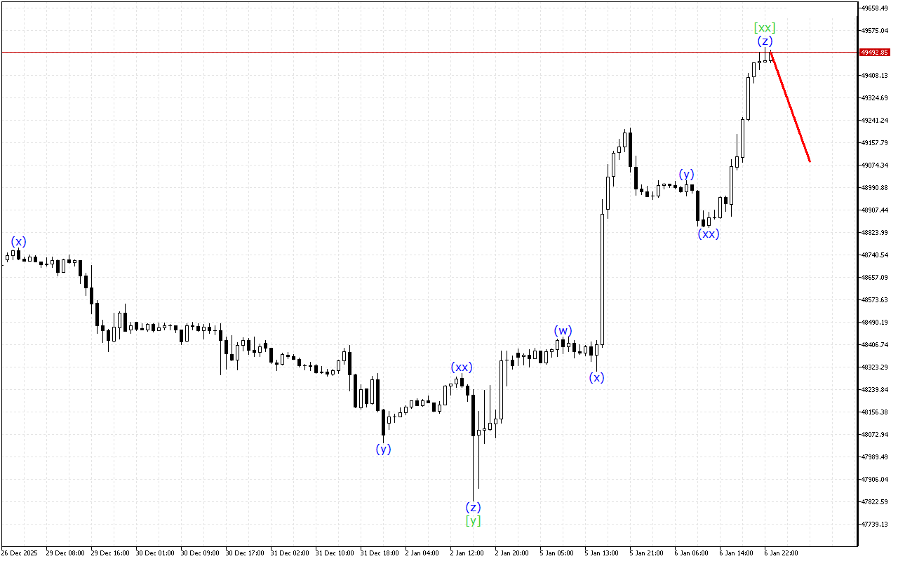 Mayroong pagbuo ng isang triple three wave structure sa isang mas mataas na time-frame. Sa kasalukuyan, nabuo na ang alon [xx]. Pagkatapos nito, dapat ipagpatuloy ng presyo ang pababang paggalaw nito.