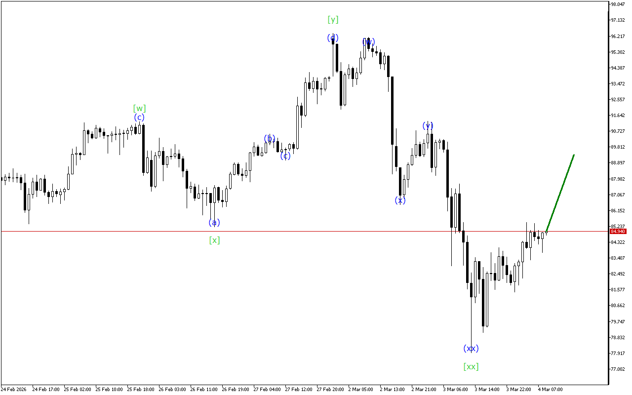 Mayroong pagbuo ng isang triple three wave structure sa isang mas mataas na time-frame. Sa kasalukuyan, nabuo na ang alon [xx]. Pagkatapos nito, dapat ipagpatuloy ng presyo ang pababang paggalaw nito.