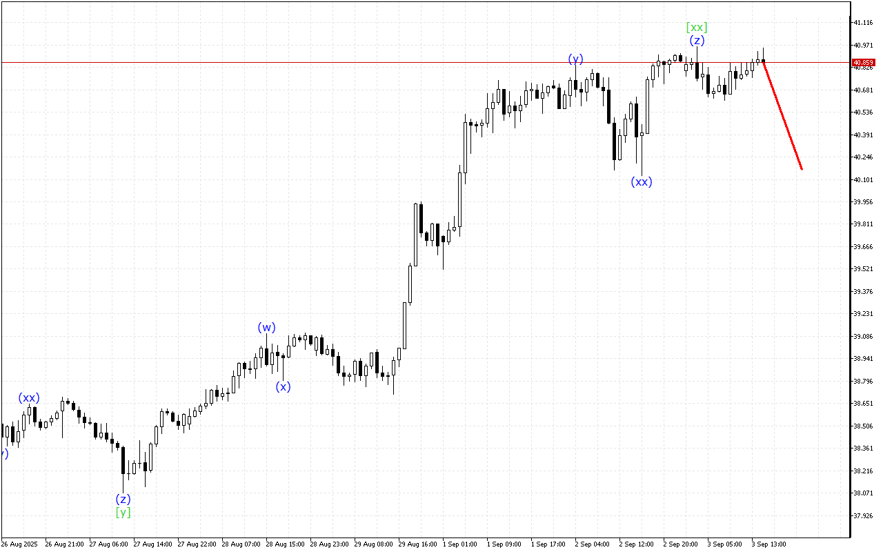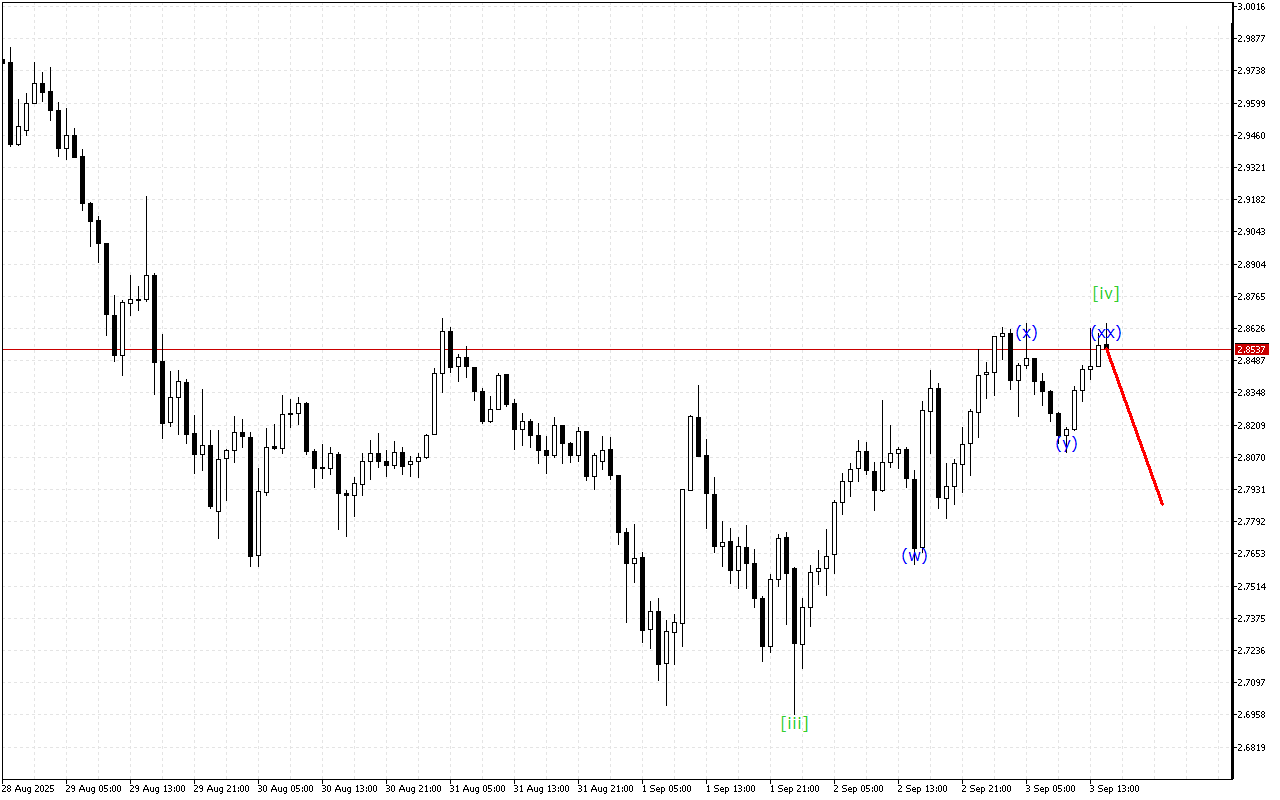 Phân tích cấu trúc sóng cấp độ cao hơn cho thấy sự hình thành của mô hình Falling Wedge (nêm giảm). Trong cấu trúc năm sóng này, sóng [iv] đã hoàn tất và dự kiến chuyển động giảm sẽ tiếp tục trong sóng [v].